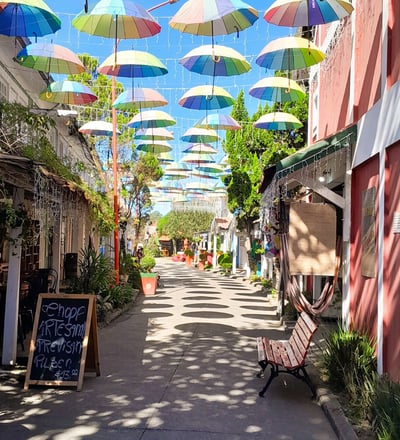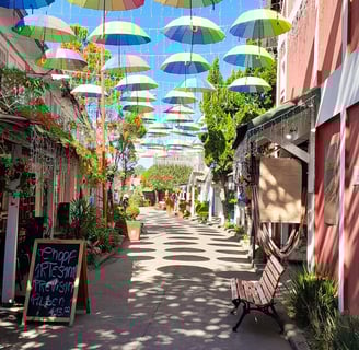 Pequenas casas com estilo finlandês, decoradas em diferentes cores, guardando sua individualidade, mas, ao mesmo tempo, seguindo uma encantadora uniformidade. Pelas ruas, que separam portas e janelas, estão os bancos de praça, convidativos a qualquer visitante que queria admirar a arquitetura ou simplesmente tomar um fôlego da caminhada. Ao olhar para o alto, pode-se vislumbrar com o colorido dos guarda-chuvas, cobrindo as ruas, seja nos dias claros de verão, ou nas noites mais frias de inverno.